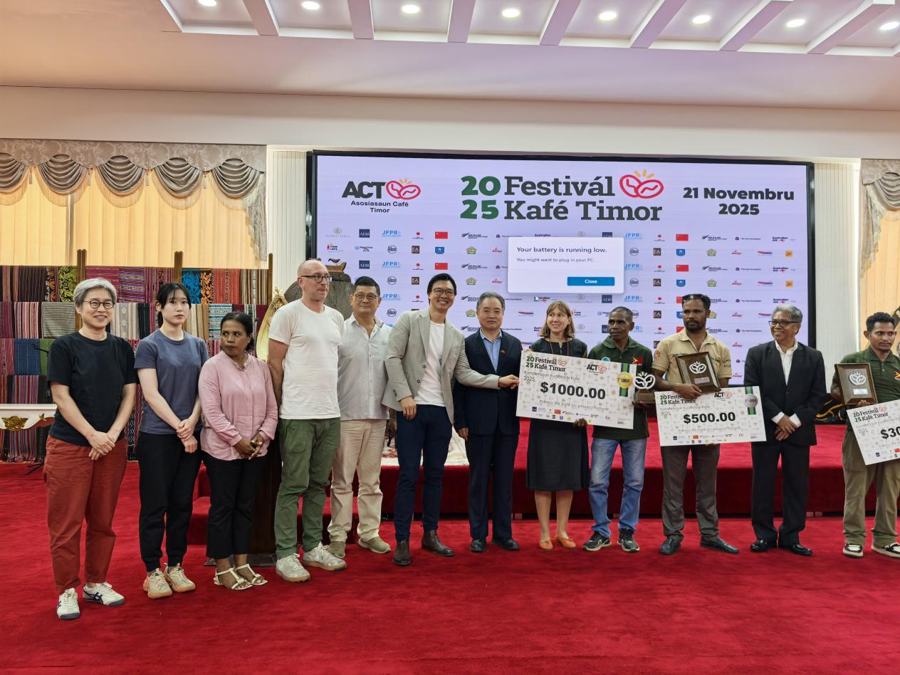 11月21日,东帝汶2025年咖啡节在帝力举办,赵锁成参赞受邀出席并为获奖选手颁奖。东农牧渔林业部部长达克鲁斯、咖啡主管官员及部分驻东使节和相关企业等出席活动。伍洋君秘书陪同参加活动。